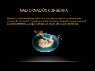 Este documento describe los diferentes tipos de agentes teratógenos que pueden causar malformaciones congénitas al interferir con el desarrollo embrionario. Explica que las malformaciones pueden deberse a causas genéticas, ambientales o multifactoriales. Entre los agentes ambientales se encuentran los infecciosos, químicos, físicos, hormonales y nutricionales. Actualmente existen técnicas de diagnóstico prenatal como la amniocentesis y la embrioscopía para detectar anomalías, y la cirug