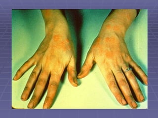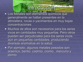 El documento habla sobre los agentes tóxicos como los metales pesados. Explica que algunos metales como el arsénico, cadmio y mercurio pueden ser perjudiciales para los seres vivos incluso en pequeñas cantidades. Además, estos metales no son degradados por la naturaleza y tienden a acumularse en los tejidos vivos causando daños graves. Finalmente, detalla algunos efectos dañinos específicos de metales como el mercurio, cadmio y plomo en la salud humana.
