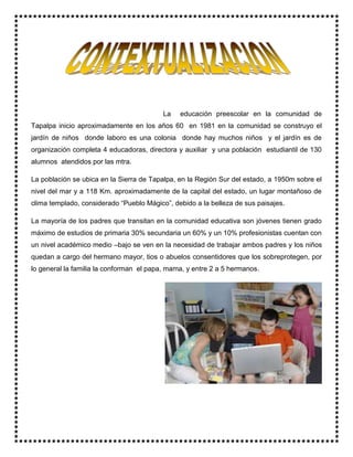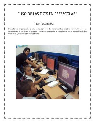 El documento describe la importancia de incorporar las TIC en la educación preescolar. Propone que las tecnologías permiten ampliar los recursos educativos y las estrategias didácticas, además de mejorar la comunicación. También destaca que es necesario capacitar a los docentes en el uso pedagógico de las TIC para apoyar el desarrollo integral de los niños.