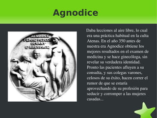 Agnodice fue la primera mujer médica y ginecóloga en la antigua Grecia en el 350 a.C., enseñando medicina en público y atendiendo pacientes bajo una identidad falsa para ocultar su sexo, a pesar de la envidia y acusaciones falsas de sus colegas masculinos celosos de su éxito.