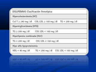 Las dislipemias son alteraciones en las lipoproteínas plasmáticas que constituyen un importante factor de riesgo para la aterosclerosis. La aterosclerosis es considerada la enfermedad cardiovascular más común y una causa principal de muerte, siendo prevenible a través de modificación de hábitos y tratamiento farmacológico. Las estatinas son el tratamiento farmacológico más efectivo para reducir el colesterol LDL y disminuir significativamente la morbilidad y mortalidad cardiovascular.