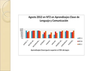 Este documento presenta los resultados de las mediciones de agosto de 2012 sobre lenguaje y comunicación para los cursos de NT1, NT2, 1o, 2o, 3o, 4o y 5o años de la Escuela República de Grecia. Se muestran los porcentajes de alumnos que lograron y no lograron el 70% de exigencia en cada uno de los componentes evaluados como aproximación a la lectura, reconocimiento de signos escritos, extracción de información, paráfrasis, argumentación e incremento de vocabulario fonológico.