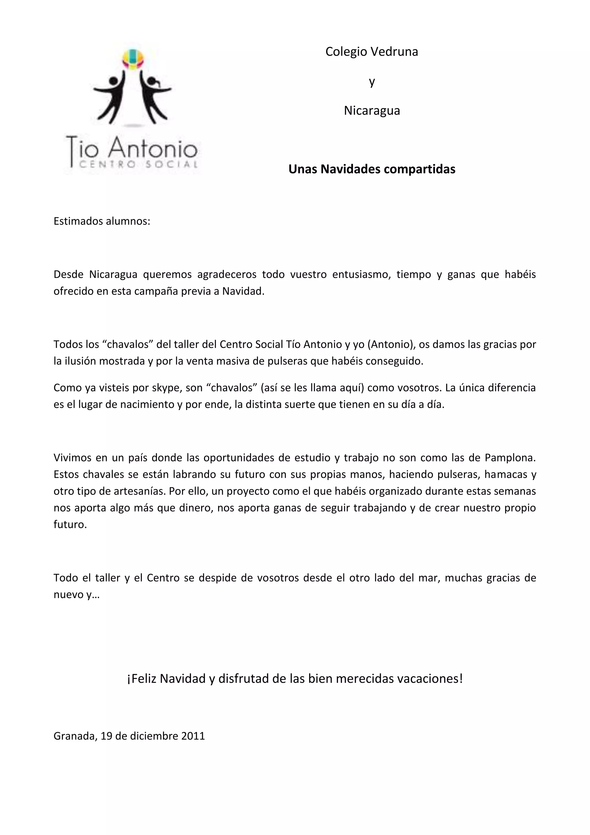 El documento es una carta de agradecimiento de un taller de artesanía en Nicaragua a los estudiantes de un colegio en España por su participación en una campaña de venta de pulseras para recaudar fondos. Los estudiantes nicaragüenses agradecen el entusiasmo y esfuerzo de los estudiantes españoles, ya que el dinero recaudado les dará la oportunidad de continuar trabajando y creando su propio futuro a través de la artesanía. El taller les desea una feliz Navidad y buenas vacaciones.