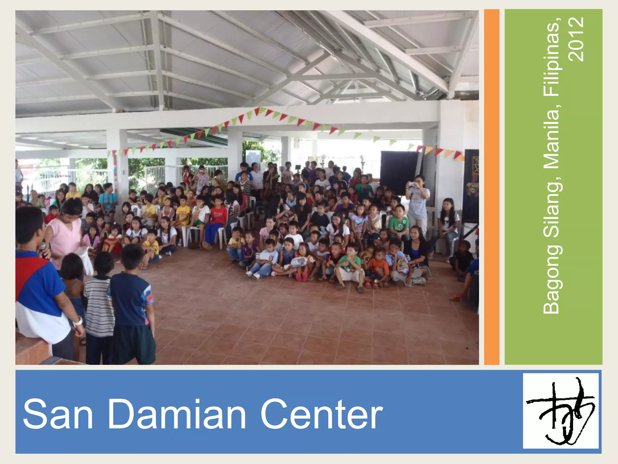 El documento presenta el progreso del San Damian Center en BagongSilang, Manila, Filipinas. Hace un año, se pidió ayuda para construir el centro y gracias a las donaciones, se completó el proyecto. El documento muestra fotos del proceso de construcción y describe las instalaciones del centro, como una clínica médica, sala de fisioterapia, aulas, cocina y parque infantil. El centro ahora sirve a la comunidad local al ofrecer servicios médicos, educación y programas de nutrición.