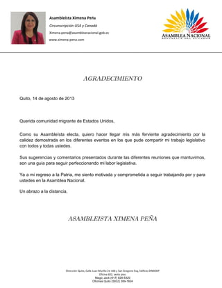 La asambleísta Ximena Peña agradece a la comunidad migrante de Estados Unidos por su calidez y sugerencias durante los eventos en los que compartieron su trabajo legislativo. Peña se siente motivada a seguir trabajando por y para la comunidad migrante en la Asamblea Nacional basándose en los comentarios recibidos.