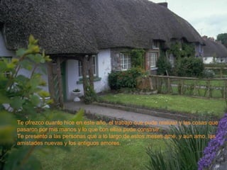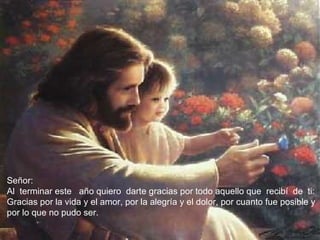 El documento es una oración dirigida a Dios al finalizar el año agradeciendo por todo lo recibido, presentando a las personas cercanas y pidiendo perdón por errores cometidos. También se pide para el nuevo año paz, alegría, fuerza, sabiduría y amor para la familia, amigos y todos los que lo rodean, y vivir cada día con optimismo, bondad y confiando en la fe.