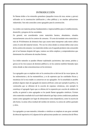 El documento trata sobre agregados para la construcción. Explica que los agregados son materiales granulares utilizados en la construcción y que pueden ser naturales, triturados o artificiales. También clasifica los agregados según su origen, composición, tamaño y otras propiedades e indica algunas canteras comunes en Perú de donde se extraen agregados. El documento provee información básica sobre los diferentes tipos y usos de agregados en la industria de la construcción.