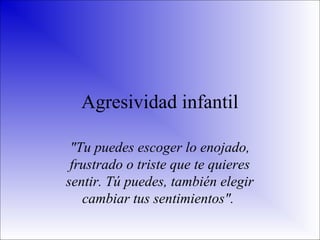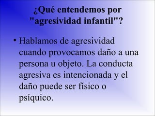 1) La agresividad infantil se presenta generalmente de forma directa a través de actos físicos o verbales, o de forma indirecta o contenida. 2) Los arrebatos de agresividad son normales en la infancia pero algunos niños persisten en esta conducta. 3) Factores como carencias afectivas, modelos agresivos, falta de límites, y relaciones familiares deterioradas pueden generar agresividad en los niños.
