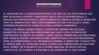 Este documento trata sobre la agresividad infantil. Explica que la agresividad es normal en niños pequeños como una forma de expresar emociones, pero que se convierte en un problema cuando es la forma habitual de resolver conflictos. Identifica varios tipos de agresividad infantil y sus posibles causas, y ofrece algunas recomendaciones para los padres y maestros.