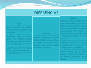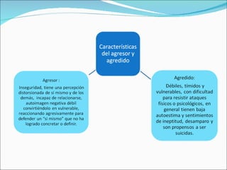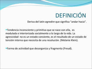 La agresividad se define como una tendencia inconsciente y primitiva que se nace con ella y se modula socialmente a lo largo de la vida. Puede ser causada por factores como la sobreprotección de los padres, la falta de relaciones interpersonales en la infancia, imitar conductas agresivas, y exponerse a contenidos agresivos en la televisión o internet. Para reducir la agresividad en estudiantes, se recomienda realizar actividades en grupo que fomenten la empatía, enseñar asertividad, construir reglas