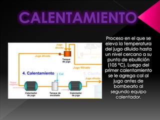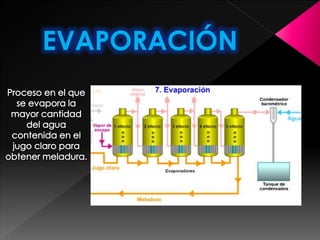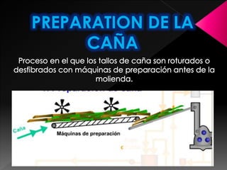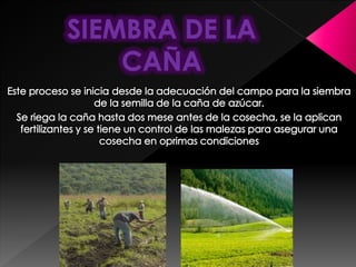 El documento describe el proceso de elaboración del azúcar de caña. La caña de azúcar se cultiva con aporte de agua por parte del agricultor, ya sea mediante el suministro de aguas superficiales o subterráneas. Luego, la caña se corta y transporta a una fábrica de azúcar donde se exprime, se filtra y se hierve para concentrar y cristalizar el jugo y producir azúcar granulada.