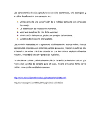 La agricultura sustentable es un sistema de producción agropecuaria que permite obtener producciones estables de forma económicamente viable y socialmente aceptable, preservando el medio ambiente y las potencialidades del suelo a largo plazo. Consiste en medidas como el uso adecuado de la tierra, técnicas de labranza que reducen la degradación del suelo, y el manejo optimizado de fertilizantes, agua y recursos naturales para mejorar los rendimientos de los cultivos sin dañar el ambiente.
