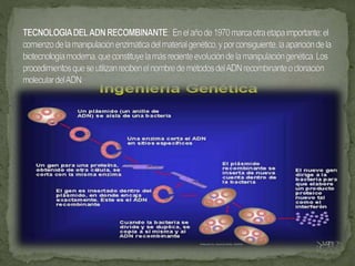 El documento aborda la biotecnología como una disciplina multidisciplinaria que combina biología y tecnología, con aplicaciones en agricultura, farmacia y medicina. Se destacan las diferencias entre biotecnología tradicional y moderna, así como sus clasificaciones: roja, blanca, verde y azul. Además, se discuten técnicas y conceptos como el ADN, vectores de transformación y la recombinación genética.