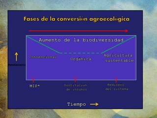 El documento trata sobre el tema de la agroecología. Explica que la agroecología estudia los fenómenos ecológicos dentro de los campos de cultivo y promueve un enfoque de la agricultura más sensible al medio ambiente y socialmente responsable. Además, describe cómo la agricultura industrial simplifica la naturaleza y depende de insumos externos, mientras que la agroecología busca restaurar los servicios ecológicos en los agroecosistemas para lograr sistemas más sustentables y resilientes.