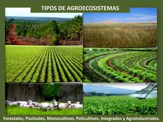 Este documento describe los diferentes tipos de agroecosistemas, incluyendo forestales, pastizales, monocultivos, policultivos e integrados. Explica que los agroecosistemas son sistemas alterados por el hombre para la agricultura y ganadería. Además, destaca que los sistemas agrosilvopastoriles pueden mejorar la producción y productividad de las familias rurales a través del uso integrado y sostenible de los recursos. Finalmente, resume que los agroecosistemas contienen elementos bióticos como