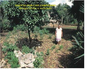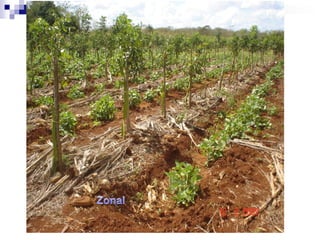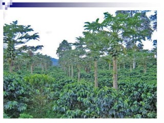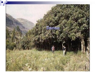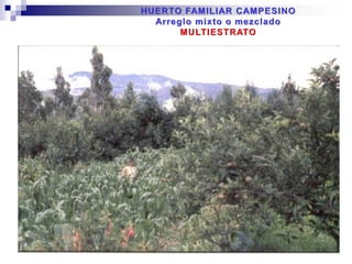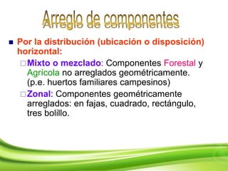 Este documento describe diferentes formas de organizar y disponer los componentes forestales y agrícolas en sistemas agroforestales. Describe la distribución horizontal (zonal vs. mixta), densidad vegetal (denso vs. disperso), estratos verticales (simple vs. multiestrato), disposición temporal (simultáneo vs. secuencial), y disposición de componentes animales (libre vs. confinado). Proporciona ejemplos de cada configuración y representaciones esquemáticas de los diferentes arreglos temporales posibles.