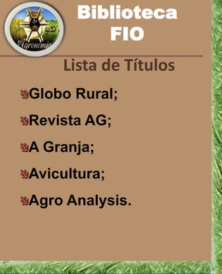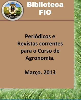 La biblioteca FIO mantiene una lista de revistas y periódicos corrientes relacionados con la agronomía para los estudiantes del curso de agronomía. La lista incluye títulos como Globo Rural, Revista AG, A Granja, Avicultura y Agro Analysis.