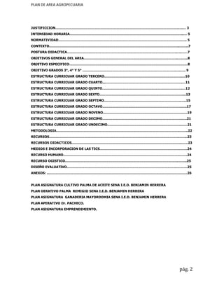 Este documento presenta el plan de estudios del área agropecuaria de la Institución Educativa Técnica Agropecuaria "Benjamín Herrera". Describe los objetivos generales y específicos del área, la estructura curricular por grados, la metodología, recursos y evaluación. El plan busca formar a los estudiantes en temas relacionados con explotaciones agropecuarias de manera sostenible, a través de una granja integral autosuficiente que aproveche los recursos de la región.