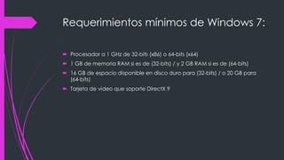 El documento proporciona instrucciones para instalar Windows 7 en 15 pasos. Describe los requisitos mínimos del sistema, como iniciar el proceso de instalación insertando el disco, seleccionar el idioma, aceptar la licencia, formatear el disco duro, crear una cuenta de usuario e insertar la clave de producto.