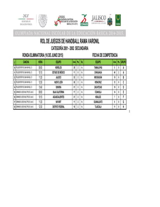 El documento presenta los resultados de la ronda eliminatoria de handball de las categorías femenil y varonil secundaria 2001-2002. Se muestran los resultados de 8 partidos de 4 equipos femeninos y 8 partidos de 4 equipos varoniles jugados el 16 de junio de 2015, con los goles y puntos obtenidos por cada equipo.