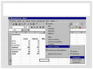 La herramienta Agrupar y Esquema permite ocultar o mostrar filas o columnas de una tabla según los subtotales, agrupando hasta 8 niveles. Esto se logra creando una tabla con subtotales y aplicando la herramienta Agrupar y Esquema, la cual agrega botones para ocultar los niveles de fila o columna. El esquema puede borrarse haciendo clic en "borrar esquema" en el menú datos.