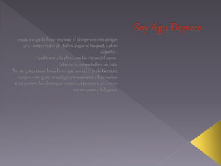 El documento contiene mensajes de varias niñas que se presentan a sí mismas. Les gusta salir con amigas, escuchar música pop, ver programas de televisión, jugar al vóley y fútbol, andar en bicicleta, y pasar tiempo con sus familias y mascotas. Mencionan sus nombres, edades, lugares de origen, signos del zodiaco, colores y actividades favoritas.