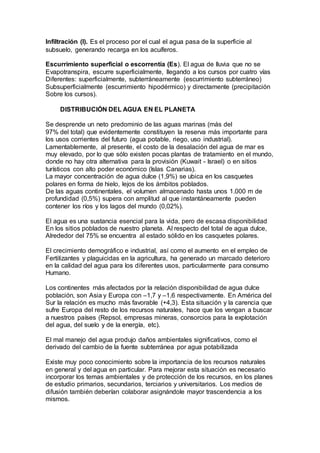 La vida en la Tierra surgió hace unos 3.500 millones de años a través de un proceso llamado abiogénesis, en el que los seres vivos se generaron a partir de sistemas inertes mediante procesos inorgánicos. El agua constituye un componente fundamental de los seres vivos y representa alrededor del 70% del peso de los bebés y del 60% en adultos. El agua es escasa en la superficie habitada de la Tierra, siendo los océanos la principal reserva de agua, aunque su desalinización es
