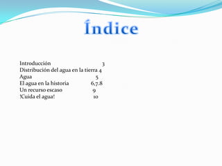 El documento describe la distribución y uso del agua en la Tierra. Solo el 2.5% del agua en la Tierra es dulce, distribuida entre lagos, ríos y acuíferos. A lo largo de la historia, las sociedades humanas han variado su uso del agua de acuerdo a sus formas de vida y hábitos de consumo. Actualmente, más de 12 mil millones de personas carecen de acceso a agua potable a pesar de los esfuerzos de organizaciones para abordar este problema.