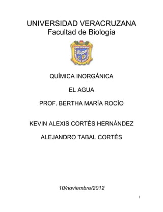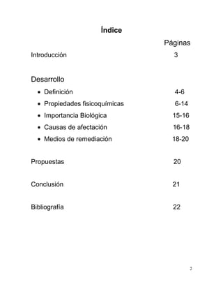 Este documento proporciona información sobre las propiedades del agua. En menos de 3 oraciones: El agua es un compuesto químico indispensable para la vida. Se compone de oxígeno e hidrógeno y tiene propiedades físicas y químicas únicas como su punto de congelación y ebullición, capacidad de disolución y transporte de nutrientes. El documento analiza las propiedades del agua, su importancia biológica, causas de afectación y métodos de remediación.
