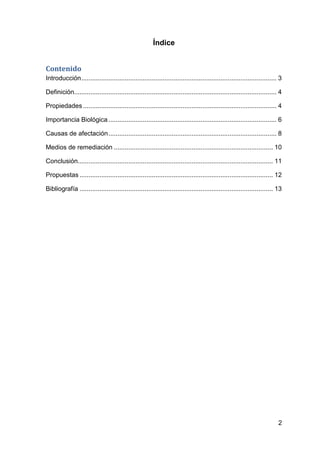 Este documento trata sobre el agua. Discute las propiedades del agua como solvente, su importancia biológica para la nutrición de plantas y regulación de fluidos en organismos, y las causas de afectación del agua como la eutroficación debido al exceso de fertilizantes y descargas de tratamiento de aguas residuales.
