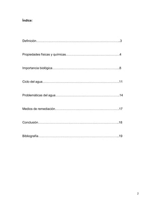 Este documento trata sobre las propiedades del agua. En las primeras secciones se define el agua y se describen sus propiedades físicas y químicas, incluyendo su composición molecular, punto de ebullición, capacidad de disolución y más. Luego se discute la importancia biológica del agua y cómo es esencial para todas las formas de vida. El documento también cubre el ciclo del agua y problemas relacionados con el agua como la escasez. Finalmente, propone medios para remediar dichos problemas.