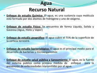 El documento presenta información sobre el agua como recurso natural desde diferentes enfoques como químico, físico, geográfico y bacteriológico. Explica las clasificaciones de fuentes de abastecimiento de agua y tipos de agua según normas venezolanas. Describe los procesos de potabilización y tratamiento de aguas residuales. Finalmente, discute los conceptos de desarrollo sostenible y planes de acción para controlar la calidad del agua.