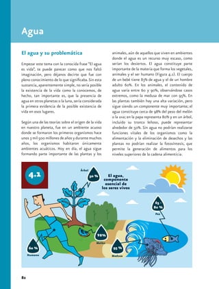 El documento describe la importancia fundamental del agua para la vida en la Tierra. El agua constituye una parte importante de todos los seres vivos y es indispensable para funciones vitales como la fotosíntesis y la eliminación de desechos. Además, el agua es necesaria para muchas actividades humanas como la agricultura, la industria y el uso doméstico. El ciclo del agua mueve continuamente el agua entre la atmósfera, la tierra y los océanos a través de la evaporación, condensación y precipitación.