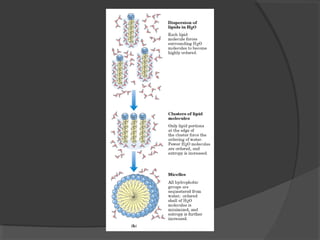El agua es el componente más abundante en el cuerpo humano, representando el 65% del peso total. No hay procesos vitales que no involucren al agua de alguna forma. El agua tiene puntos de fusión y ebullición únicos, y puede disociar sustancias iónicas y polares debido a su polaridad y capacidad de formar enlaces de hidrógeno, lo que explica sus propiedades anómalas como solvente y su habilidad para conducir la corriente eléctrica cuando es electrolito.