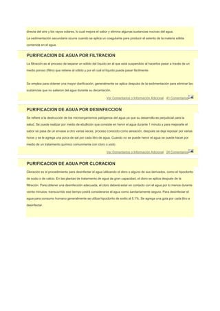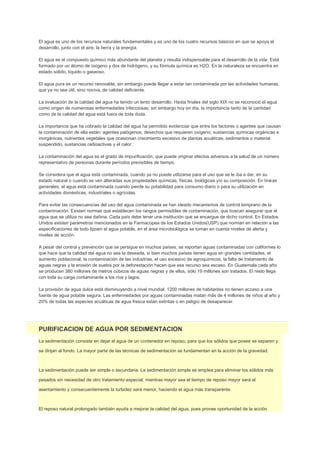 El documento describe la importancia del agua como un recurso natural fundamental para la vida. Explica que el agua puede contaminarse por las actividades humanas y perder su calidad y potabilidad. También detalla varios métodos para purificar el agua contaminada, incluyendo la sedimentación, filtración, desinfección y cloración. La contaminación del agua es un problema mundial que amenaza la salud pública y el medio ambiente.