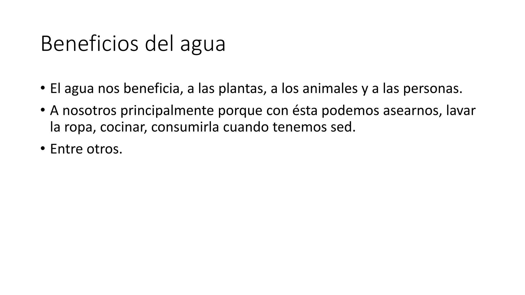 El documento describe los beneficios del agua para las personas, plantas y animales, incluyendo su uso para la higiene personal, lavado de ropa y cocina. También recomienda consumir agua mineral u de manantiales en lugar de agua del grifo debido a posibles microbios. Además, detalla la pérdida diaria de agua en el cuerpo humano a través de la orina, pulmones, piel y heces.