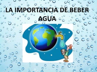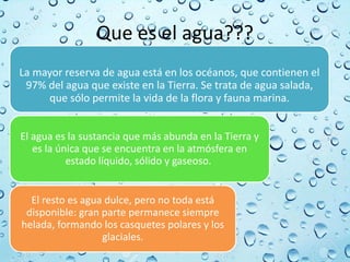 El documento describe la importancia del agua. Explica que el agua es la sustancia más abundante en la Tierra y se encuentra en los océanos, la atmósfera y glaciares. El agua sirve para quitar la sed, prevenir dolores de cabeza, desintoxicar el cuerpo, mantener el balance interno y regular la temperatura. Además, las propiedades físicas y químicas del agua, como su capacidad para almacenar y liberar calor y disolver sustancias, son esenciales para los procesos biol