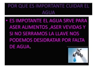 El documento resume por qué es importante cuidar el agua, cómo cuidar el agua cerrando las llaves cuando no se esté usando el agua y no dejando gotear las llaves, y qué podría suceder si no cuidamos el agua como deshidratación e incluso la muerte por sed.