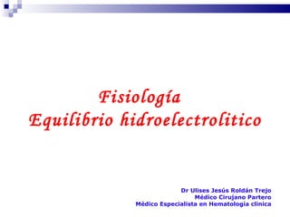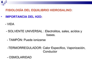El documento describe la fisiología del equilibrio hidroelectrolítico en el cuerpo humano. Explica que el agua y los electrolitos como el sodio, potasio y calcio deben mantenerse en niveles adecuados para el funcionamiento normal del organismo. Detalla los mecanismos de regulación del balance hídrico y electrolítico, incluyendo la importancia del riñón, la piel, los pulmones y otros órganos y sistemas. También define conceptos como la hiponatremia, hipernatremia, hip
