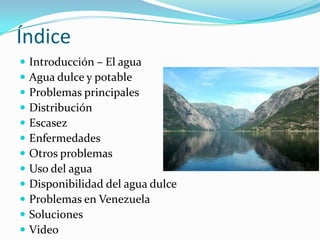 Este documento discute los problemas relacionados con el agua dulce y potable en el mundo. Explica que aunque el agua cubre la mayor parte del planeta, solo el 3% es agua dulce y potable. Los principales problemas son la distribución desigual del agua dulce, la escasez en algunas regiones, y la contaminación que causa enfermedades. También analiza el uso y disponibilidad del agua dulce, así como problemas específicos en Venezuela y posibles soluciones.