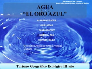 El documento presenta información sobre la importancia del agua y la necesidad de su conservación. Resume que el agua es esencial para la vida pero los recursos hídricos mundiales están disminuyendo debido al aumento de la población y actividades humanas como la deforestación y contaminación. Además, destaca la relevancia del agua para el turismo en Panamá a través de actividades como el ecoturismo y deportes acuáticos.