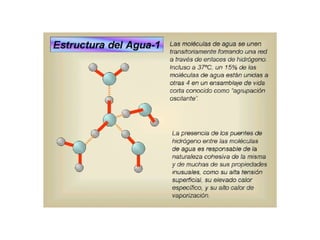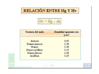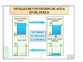 El documento describe el ciclo del agua en el suelo y cómo se encuentra presente en diferentes formas. Explica que el agua puede encontrarse químicamente unida a compuestos, adsorbida a partículas del suelo, o moviéndose libremente por gravedad. También discute conceptos como la capacidad de campo, el punto de marchitamiento, y la transpiración de las plantas, que juegan un papel importante en la disponibilidad de agua para los cultivos.