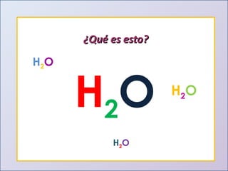 Este documento presenta una introducción al estudio del agua y sus propiedades químicas. Explica que se discutirán temas como la disponibilidad del agua, contaminación, importancia para la vida y más. También describe los tres niveles de representación del agua: macroscópico, submicroscópico y simbólico. Finalmente, proporciona una tabla con las propiedades físicas de compuestos con la fórmula general H2X.