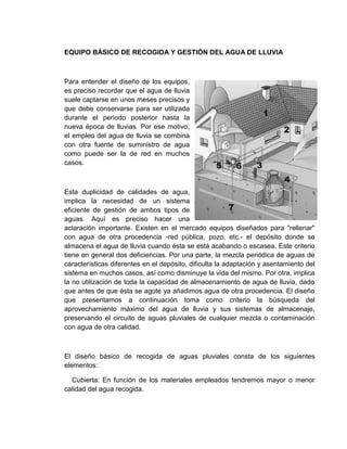 El documento describe un sistema básico para la recolección y almacenamiento de agua lluvia. Explica que un edificio de 100 m2 podría recolectar aproximadamente 48,000 litros de agua lluvia por año, la cual puede usarse para usos domésticos como lavandería y riego. Luego detalla los componentes clave del sistema como la cubierta, canalones, filtros, depósito subterráneo, bomba, y válvulas para interconectar con el agua de la red cuando escasee el agua lluvia.