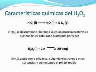 El documento describe las propiedades químicas y usos del peróxido de hidrógeno (H2O2). Se descompone en agua y oxígeno de forma exotérmica y puede ser catalizada por la luz o sustancias como el hierro o la levadura. Se usa como desinfectante, blanqueador en detergentes, y su descomposición por catalizadores se estudió experimentalmente.