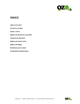 El documento describe los beneficios del agua ozonizada para la salud e higiene. El ozono elimina bacterias, virus y otros microorganismos del agua y los alimentos. El agua ozonizada puede usarse para limpiar alimentos, utensilios, la boca y el cuerpo. Proporciona una desinfección más efectiva y ecológica que el cloro. El ozono se descompone rápidamente en oxígeno puro, por lo que no genera subproductos tóxicos.