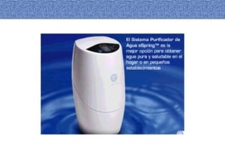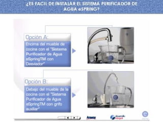 El documento describe las razones por las que es importante purificar el agua que bebemos. Explica que debemos eliminar contaminantes primarios y secundarios que pueden dañar nuestra salud. También describe el sistema purificador de agua eSpring, destacando que elimina más de 140 contaminantes, es fácil de usar y ofrece una garantía de tres años.