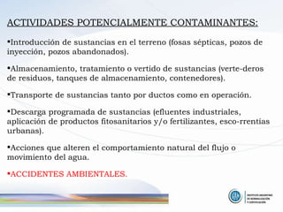 La contaminación del agua subterránea ocurre cuando se modifican las características físicas, químicas o biológicas del agua de forma indeseable, ya sea por procesos naturales o actividades humanas como la agricultura, la industria y el uso doméstico. La vulnerabilidad de un acuífero depende de factores como la litología, la porosidad y el espesor de la zona no saturada, y determina el riesgo de contaminación. Es importante monitorear la calidad del agua subterránea