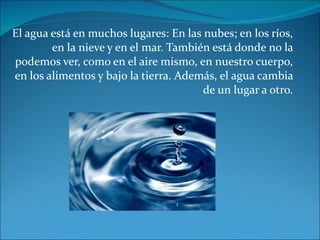 El documento describe la importancia del agua para la vida y cómo está presente en muchos lugares, incluso donde no se puede ver. Explica que beber al menos 8 vasos de agua al día puede reducir significativamente el riesgo de varios tipos de cáncer. También enfatiza la necesidad de cuidar el agua y no desperdiciarla para asegurar su disponibilidad futura.