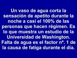 Un estudio muestra que beber un vaso de agua reduce el apetito en casi el 100% de las personas que hacen dieta. Tomar 8-10 vasos de agua al día puede aliviar significativamente el dolor de espalda y articulaciones en el 80% de las personas. Una reducción del 2% del agua en el cuerpo puede causar problemas de memoria y concentración. Beber 5 vasos de agua al día puede disminuir el riesgo de cáncer en hasta un 79%.